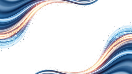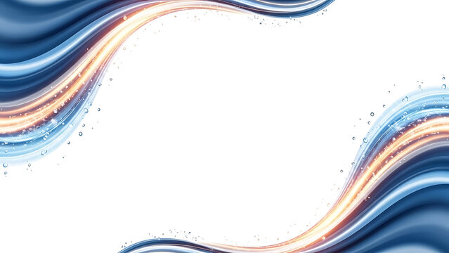 Abstract flowing blue and orange light waves with sparkling particles creating a dynamic frame on a white background.