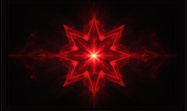 Abstract glowing red starburst in the center of a dark frame, soft gradient lighting and sharp edges creating a dynamic cosmic design,