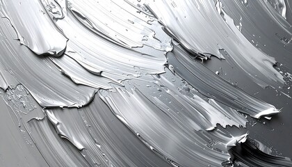 Shiny silvery paint strokes form an abstract textured pattern with deep ridges and highlights, creating a sense of movement