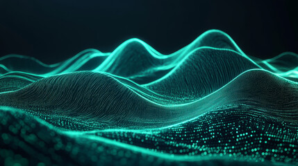 Futuristic dark abstract background featuring green neon light trails and glowing energy waves on black. Ideal for technology, sci-fi, and digital-themed designs