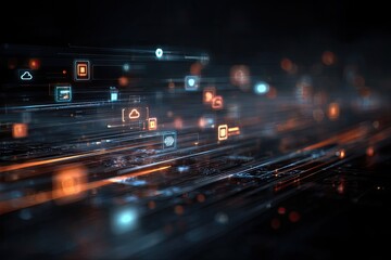 Abstract digital network graphic with glowing icons.  Data streams and connections