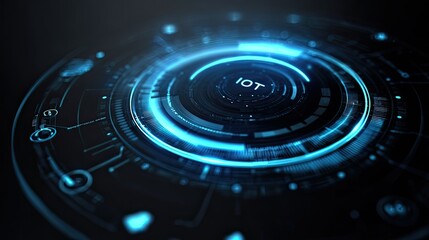 Dynamic neon blue digital interface displaying the word IOT, symbolizing future technology and connectivity with intricate glowing circuits and data streams.