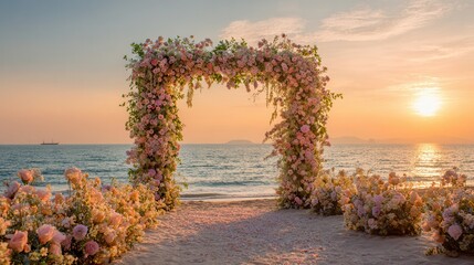 Golden Hour Wedding Archway: A picturesque wedding arch, adorned with delicate floral arrangements, frames the breathtaking vista of a tranquil beach at sunset.