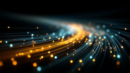Abstract glowing strands of orange and yellow light flow dynamically in a dark bokeh filled background