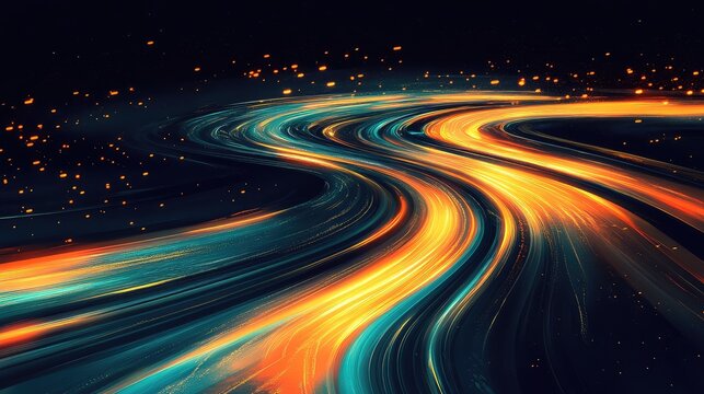 Swirling lines of vibrant orange and teal light create an abstract, high speed energy flow, representing concepts of rapid data movement, advanced networking, and technological innovation