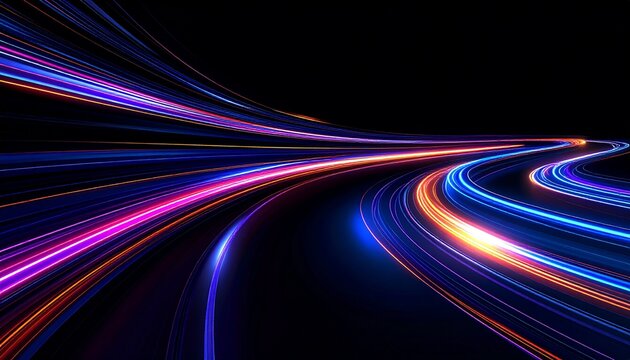 A digital highway of light trails representing fast data transfer, symbolizing the speed and connectivity of technology in an abstract composition