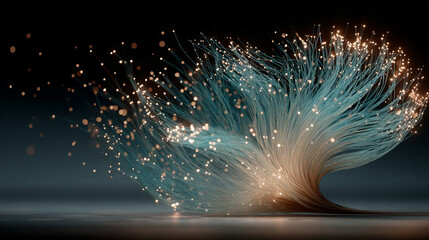 Abstract depiction of a futuristic fiber optic network with vibrant light trails symbolizing fast and efficient data transfer across a technological landscape  The image conveys a sense of energy