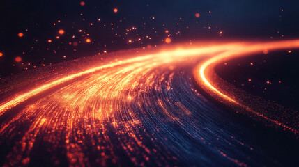 Abstract 3D rendering of dynamic light trails on a dark background. Symbolizing high-speed optical fiber, fast data transfer, and futuristic digital communication technology.