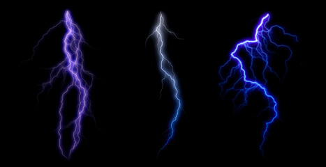 Set of three electric lightning effects with glowing highlights and purple blue white colors for storm weather design or fantasy energy visuals
