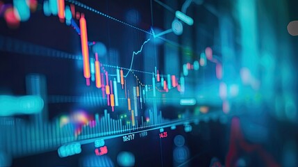 Abstract visualization of financial data with glowing graphs, numbers, and stock market trends on a futuristic interface.