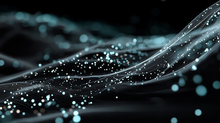 Abstract digital data wave with glowing particles and dynamic lines on a dark background, technology concept and data visualization. 3D zoom in animation