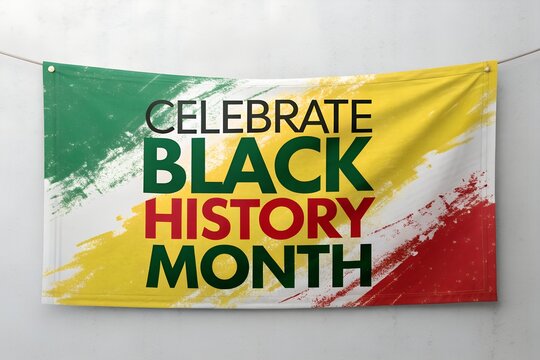 Vibrant textile banner prominently displaying the powerful message celebrate black history month featuring bold typography against a dynamic brushstroke background using pan african colors for cultura