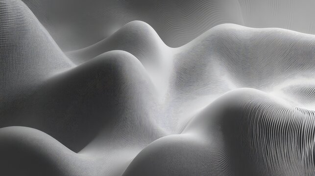 Abstract digital rendering showing flowing grey and white waves with intricate fine lines and subtle variations, forming a dynamic and textured background representing data, sound, or organic forms