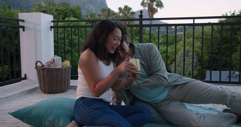 Young friends enjoying summer evening on beach overlayed with u.s. Flag