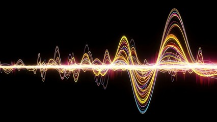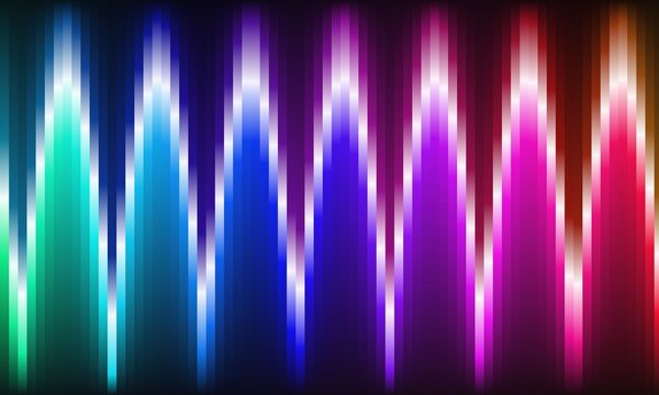 Vibrant, multicolored equalizer waveform with lens flares against dark