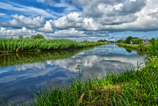 Verdant greenery bordering serene drainage canal, reflecting dynamic cloudscape across typical dutch polder landscape