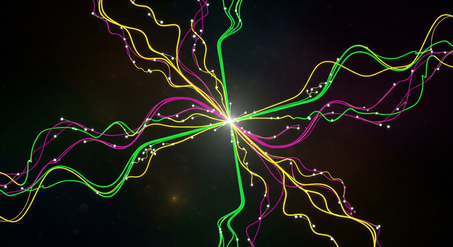 Abstract vibrant lines and light trails radiating from a central glowing point
