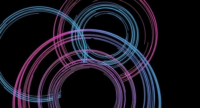 A mesmerizing display of neon circles intertwines against a stark black background, creating a vibrant and dynamic abstract composition with glowing lines