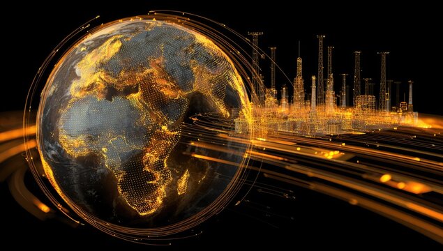 A glowing world map overlaid on an industrial landscape, symbolizing global connectivity, technology, and energy.