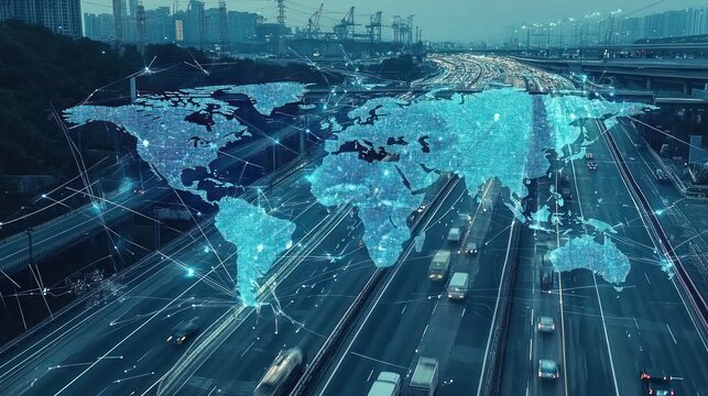 Digital world map overlayed on a busy highway, illustrating the interconnectedness of global trade routes and modern transportation systems