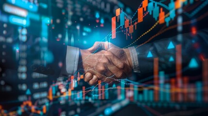 Two people in a handshake over dynamic digital stock market data visualization on a dark background