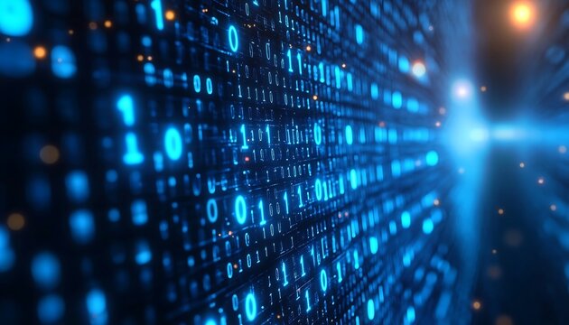 Glowing blue dots and binary code flow across a dark background, suggesting data processing