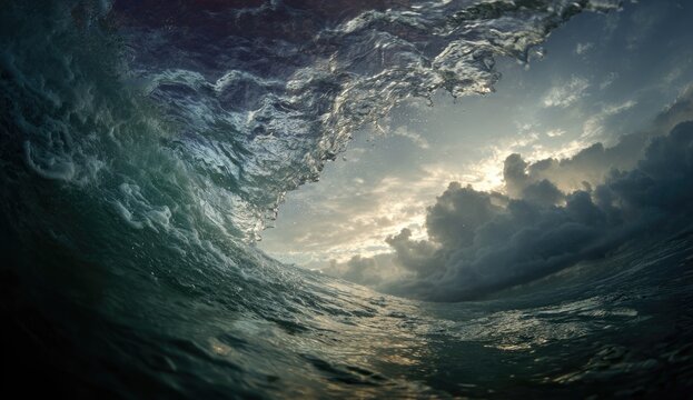 Dramatic ocean wave understormy sky with dynamic foam