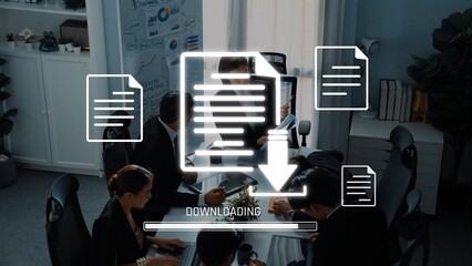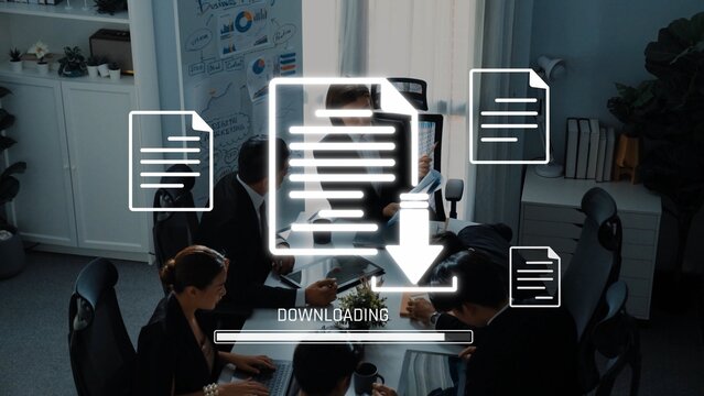 A dynamic office scene showcases a team engaged in collaboration, highlighted by a prominent downloading icon, emphasizing digital workflow and effective file management strategies. Raster
