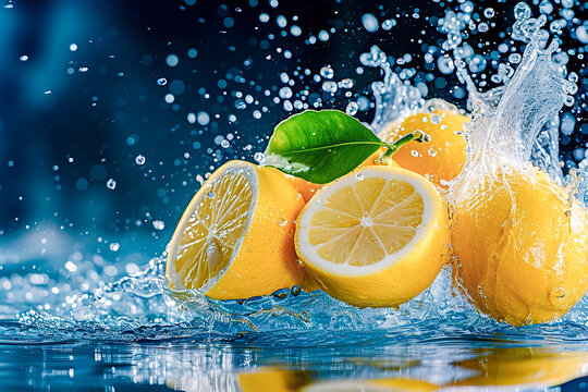 Fresh lemons with a green leaf splashing into water, creating dynamic droplets and waves, against a blue background, ai generative