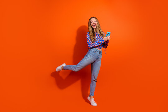 Excited young woman holding a smartphone in a playful pose against an orange background, enjoying technology and lifestyle.