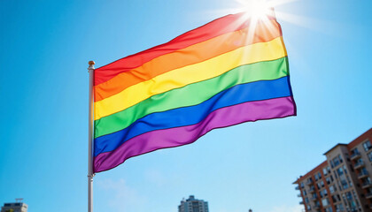 A vibrant rainbow flag billows in the wind against a backdrop of a bright blue sky, symbolizing diversity, freedom, and inclusivity in a dynamic atmosphere.