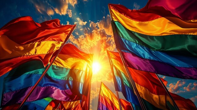 multiple pride flags waving in the wind, set against a backdrop of a sunset sky. The vibrant colors and dynamic setting convey a sense of celebration and inclusivity.