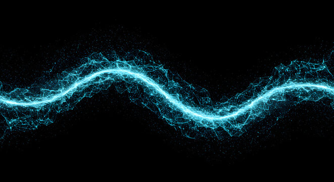 Pulsing neon blue energy waveflow crossing black space with glowing filaments