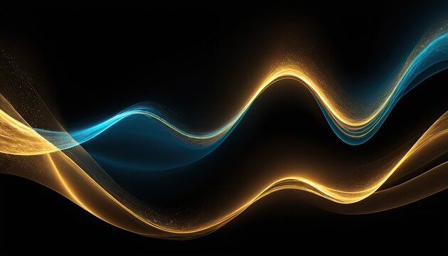 Abstract futuristic background with gold and blue glowing neon moving high speed wave lines and bokeh lights.