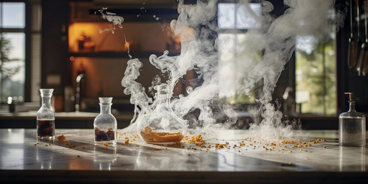 chemical reaction, effervescence in a test tube, bubbles and smoke, set on a marble countertop, high dynamic range, natural window light