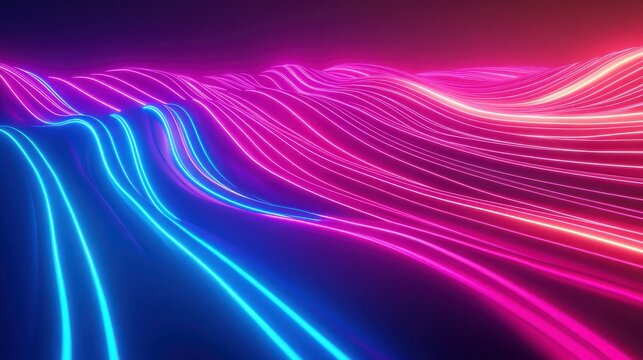 Dynamic neon wave landscape with vibrant pink and blue light trails creates an abstract futuristic background.