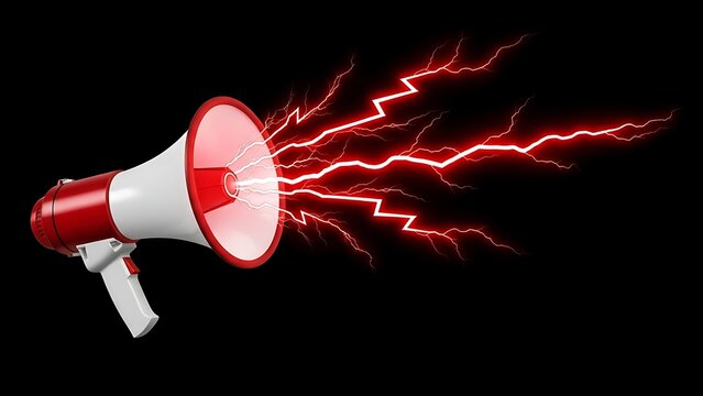 Red and white megaphone emitting red lightning bolts symbolizing powerful communication on a black background