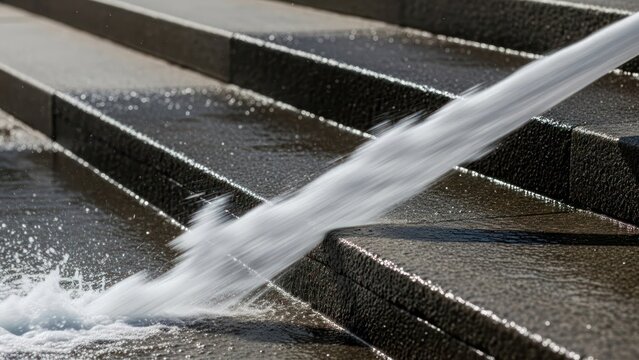 Water cascades down dark, wet steps, creating a dynamic splash