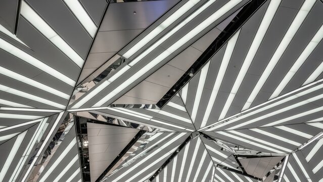 Angular ceiling structure with striped illuminated panels  reflective surfaces creates a dynamic geometric pattern