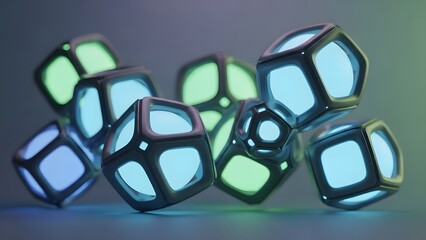 A collection of glowing futuristic cubes in blue and green hues, arranged in an abstract and dynamic composition.