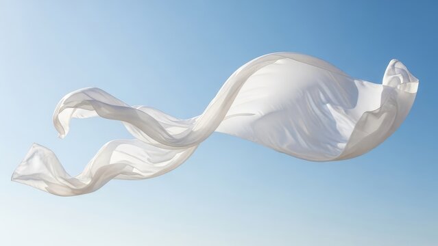 A flowing white fabric in the wind against a blue sky