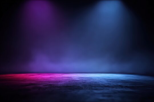 Abstract Stage with Purple and Blue Spotlight on Grungy Concrete Floor in Dark Backdrop