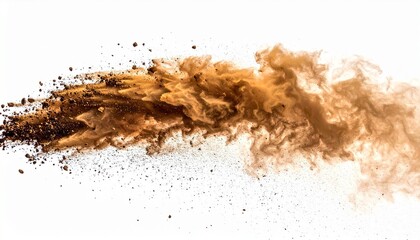 Explosion of brown powder and dirt particles on a white background, dynamic abstract motion of dust and soil, high-speed photography, isolated for design elements