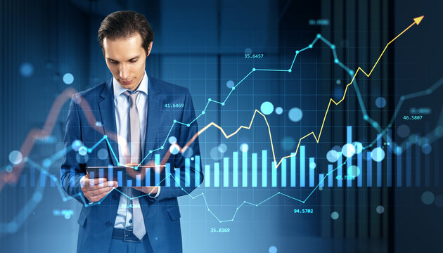 Businessman analyzing financial data on digital tablet with dynamic stock market chart and holographic currency graphs in modern office background.