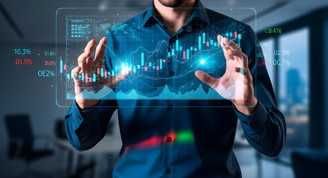 Dynamic businessman analyzing financial data with holographic interface, modern tech concept