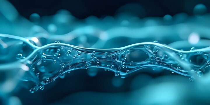 Macro photography of water surface with dynamic splash and bubbles in turquoise blue tones, showing fluid motion and transparency against dark background.