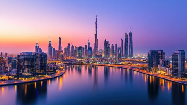 A dynamic composition of a city skyline at dusk with illuminated skyscrapers reflecting in a river, aerial shot, Urban style