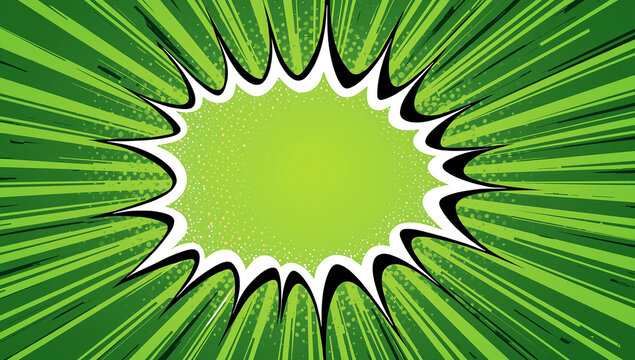 Comic book explosion frame green background, pop art retro style radial burst with halftone dots, abstract blank template for text, cartoon action design, dynamic starburst backdrop illustration