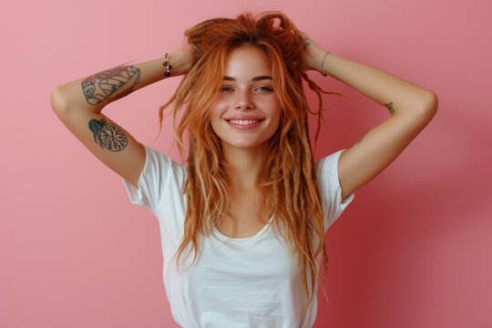 Cheerful red-haired woman with tattoos posing against rustic background