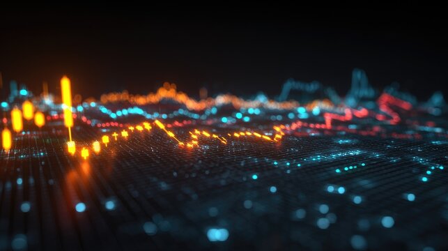 Abstract digital chart visualization of fluctuating data with orange and teal highlights